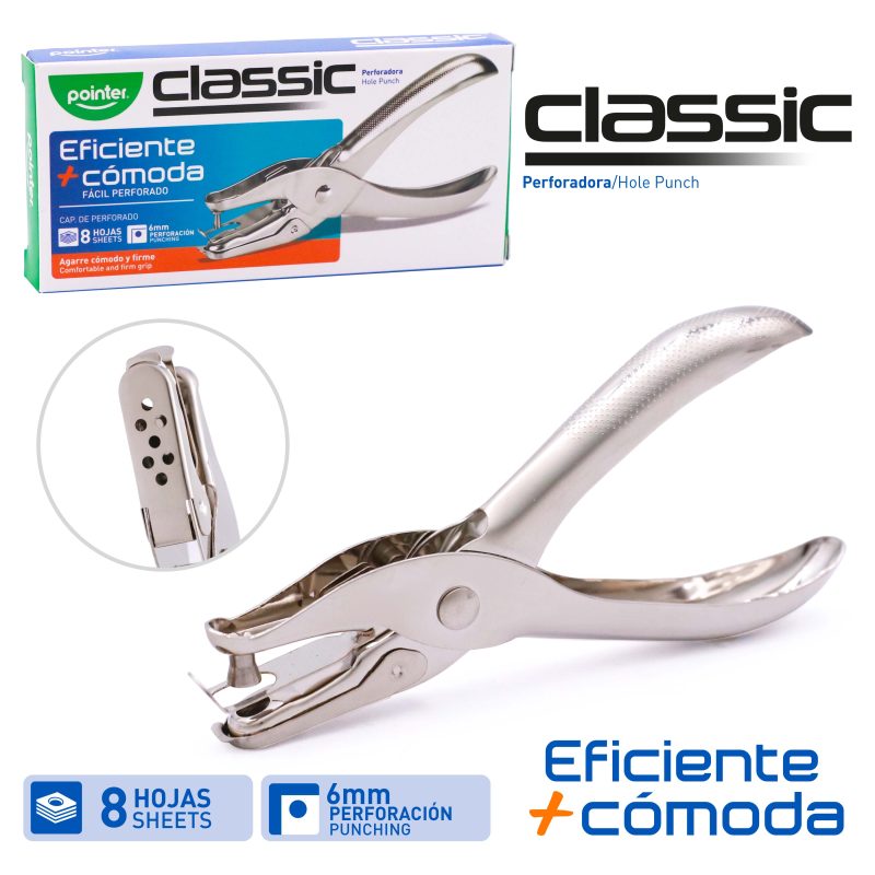 La Perforadora Pointer Classic de 2 orificios combina precisión, funcionalidad y diseño moderno para facilitar la organización de documentos en oficinas, escuelas y el hogar. Su estructura resistente permite una perforación limpia y alineada con el mínimo esfuerzo.