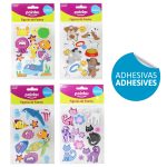 Son fáciles de aplicar sobre superficies lisas como papel, cartulina, cartón, foamy y plástico, lo que los convierte en un recurso práctico para manualidades escolares, decoración creativa, proyectos DIY y trabajos artísticos. Su presentación en láminas surtidas ofrece gran versatilidad para diferentes estilos y temáticas.