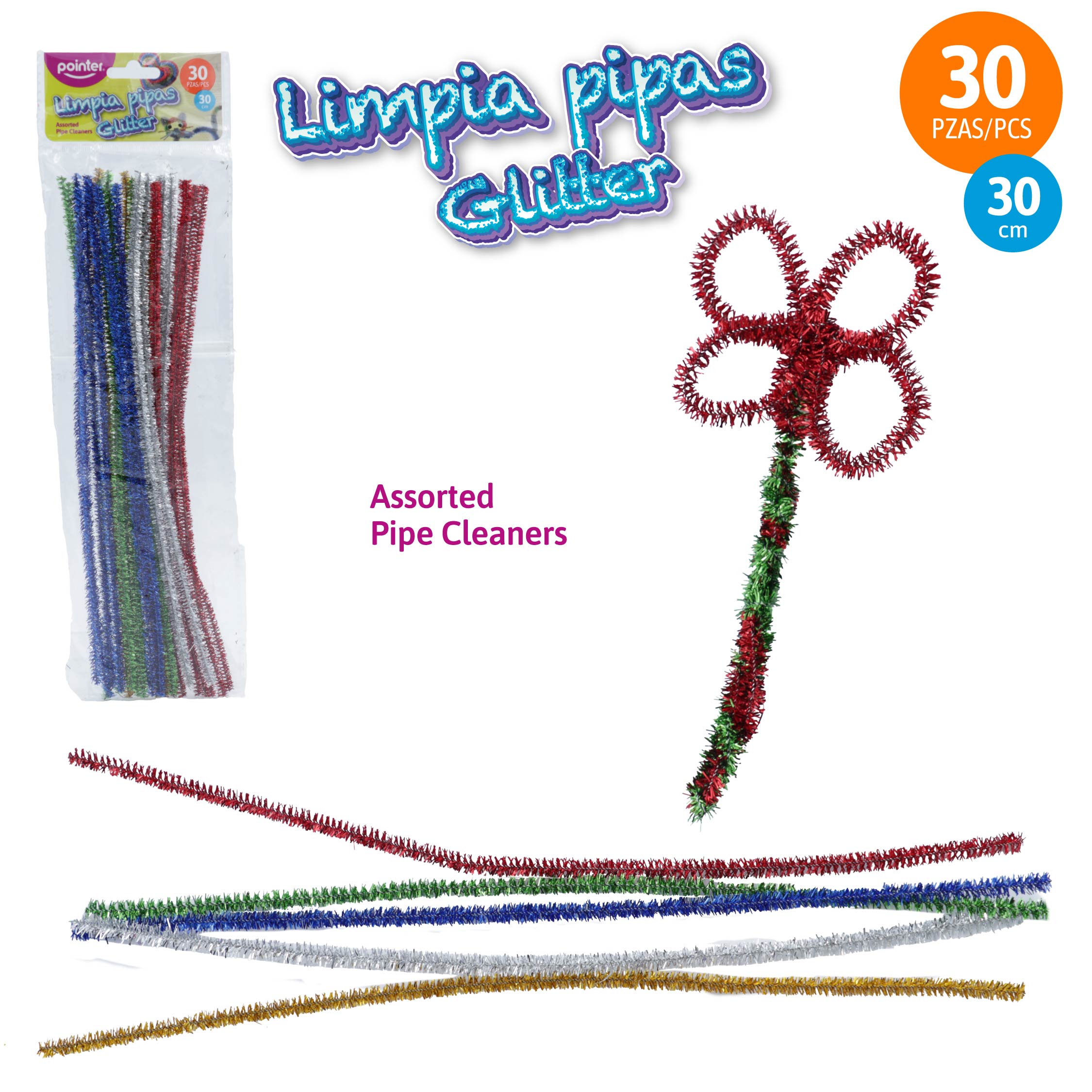 Limpia Pipas Glitter Pointer – Paquete de 30 Piezas (30cm)