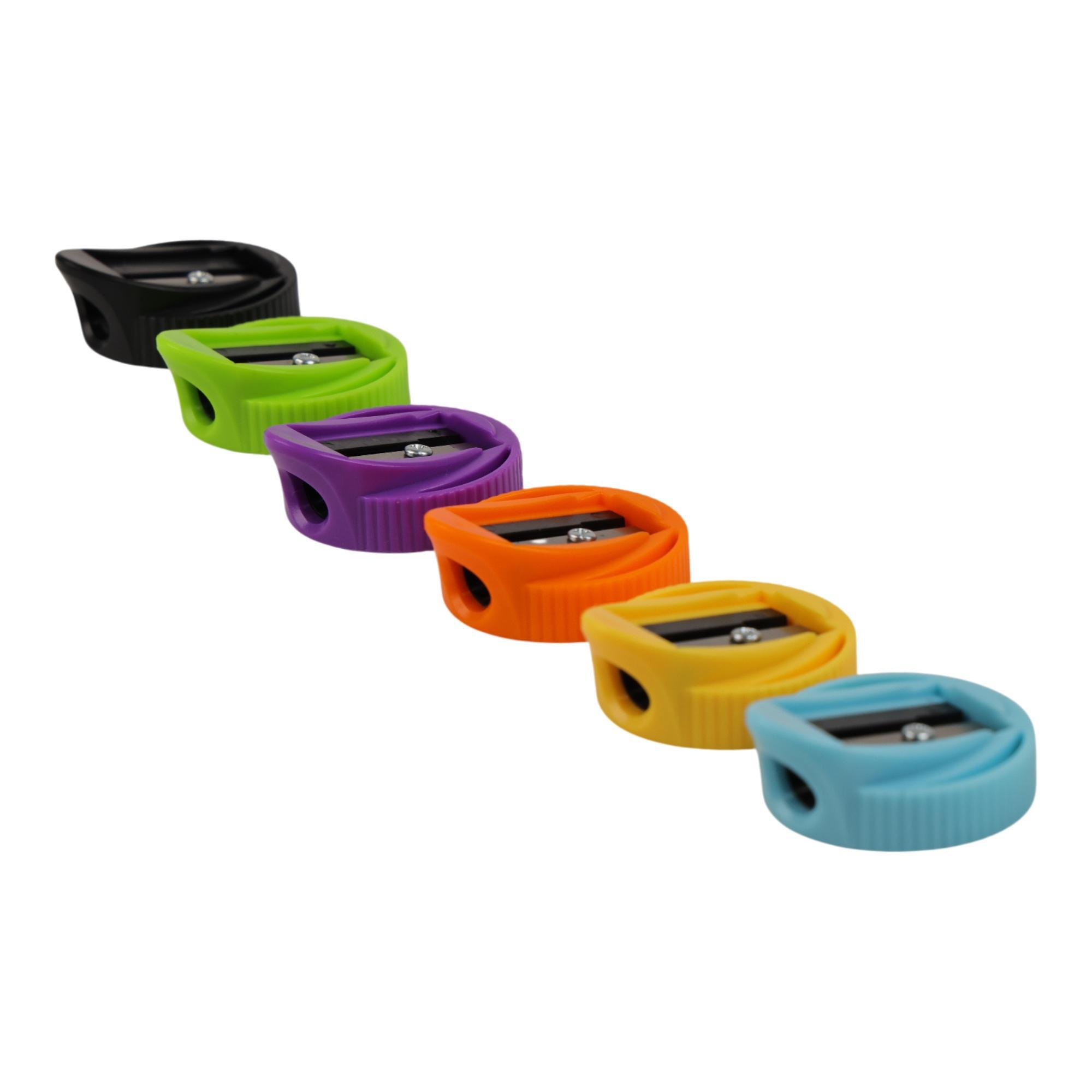 Los sacapuntas cuentan con un diseño ergonómico y una abertura estándar compatible con lápices de grafito comunes. La cuchilla metálica asegura un corte preciso, ayudando a prolongar la vida útil del lápiz. Gracias a sus colores llamativos, resultan atractivos para estudiantes y fomentan un uso individual identificado.