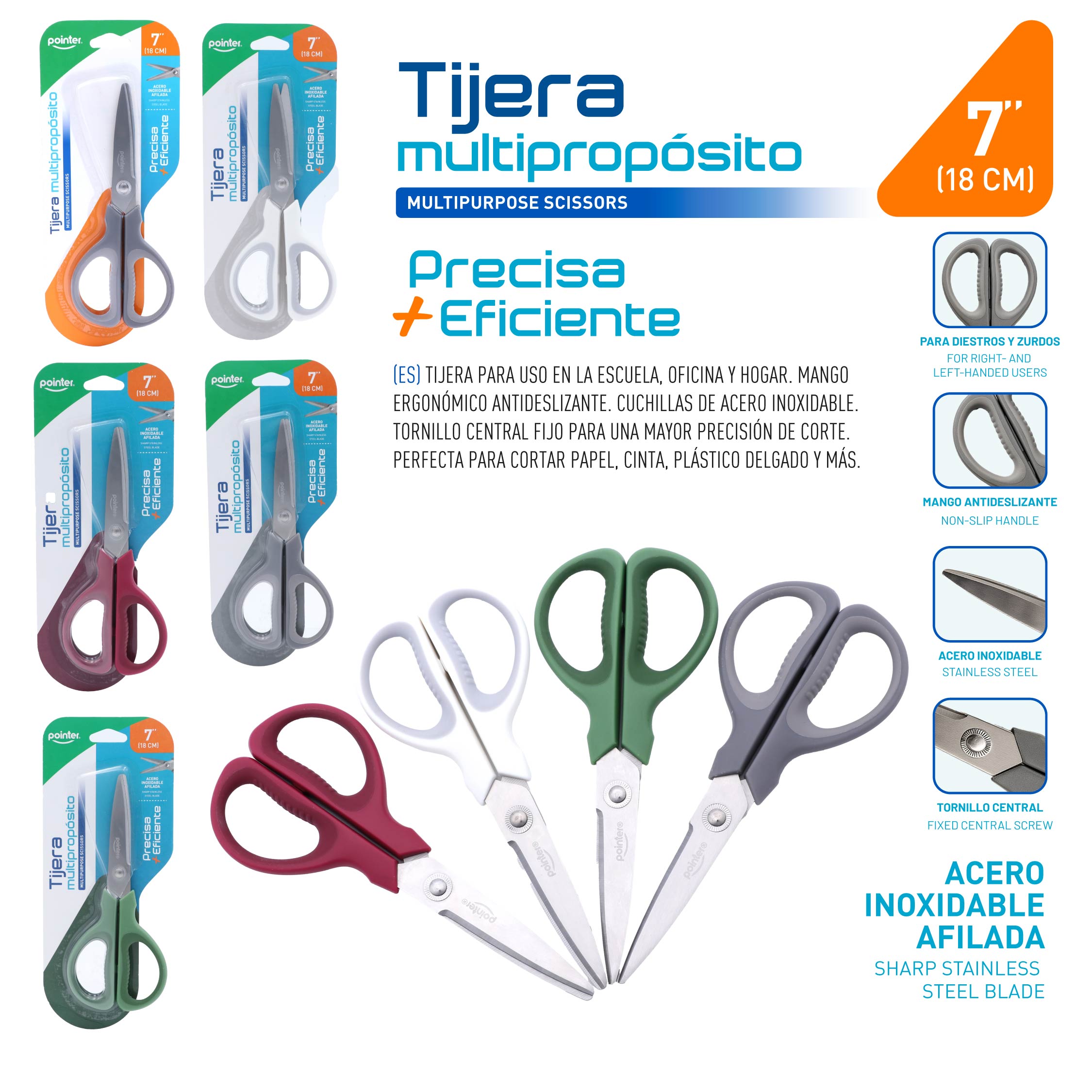 La tijera multipropósito Pointer 7” está diseñada para quienes buscan rendimiento y durabilidad en una sola herramienta. Sus cuchillas de acero inoxidable proporcionan un corte limpio y continuo en papel, cartulina, cinta adhesiva, plástico delgado y otros materiales de uso cotidiano.